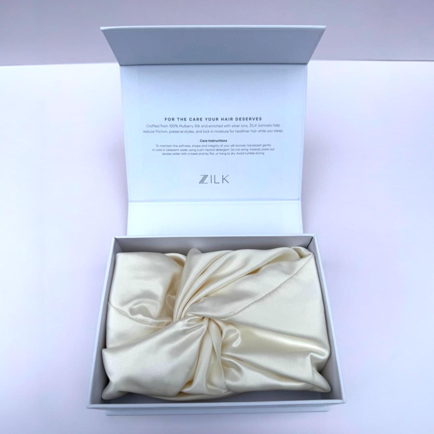 The ZILK Silk Hair Bonnet is designed to support your healthiest hair while you rest. Crafted from 100% silver-ion infused Mulberry silk and double lined inside and out, it helps reduce friction, preserve moisture and keep styles smoother by morning.