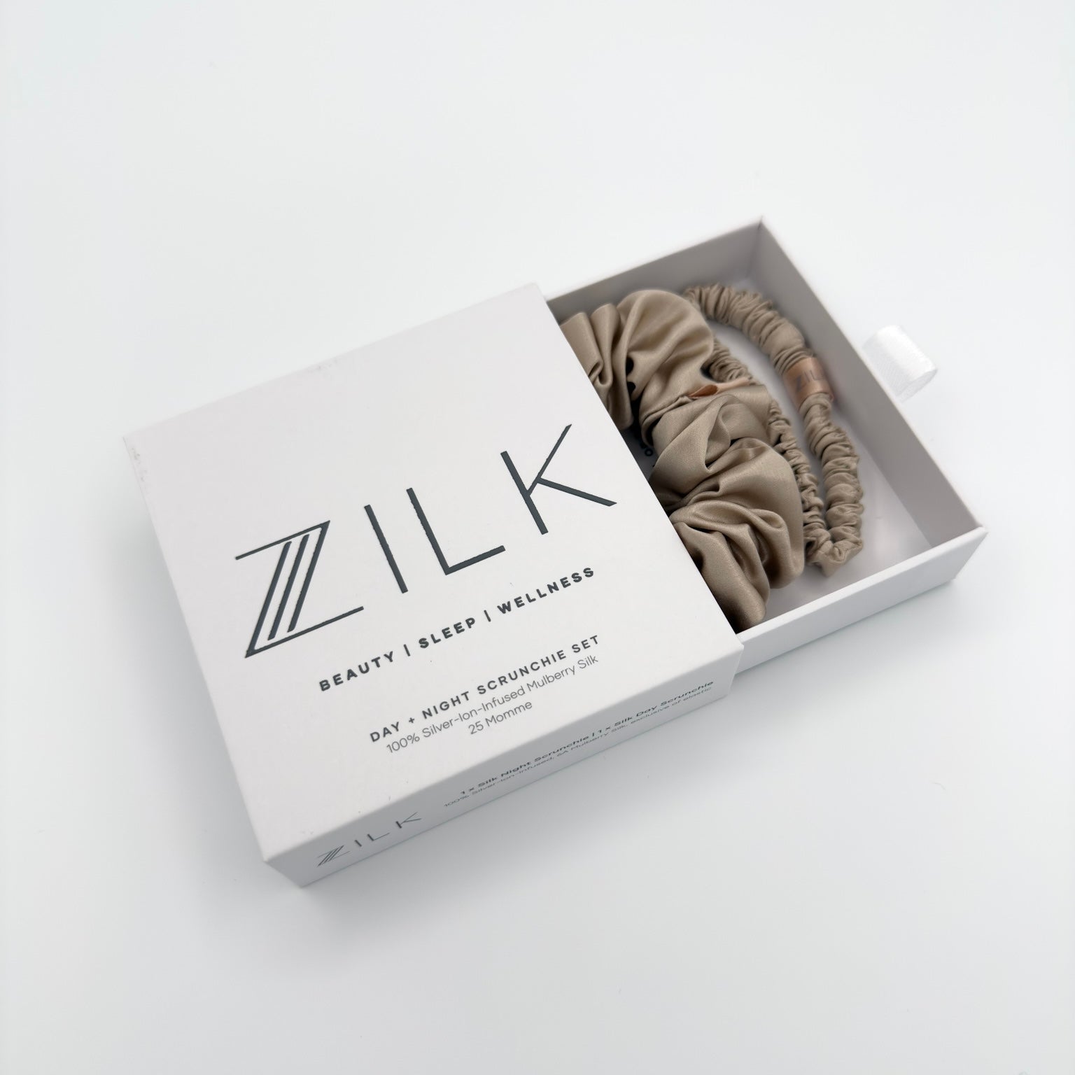 The ZILK Day + Night Scrunchie Set includes two silk scrunchies designed to protect your hair around the clock. The slim “day” scrunchie offers a sleek, comfortable hold without creasing or pulling. The plush “night” scrunchie is soft and protective, ideal for sleep or post-shower care. Crafted with our signature NeuroSilk™, both scrunchies help reduce friction, minimize breakage, and keep hair healthier and smoother.