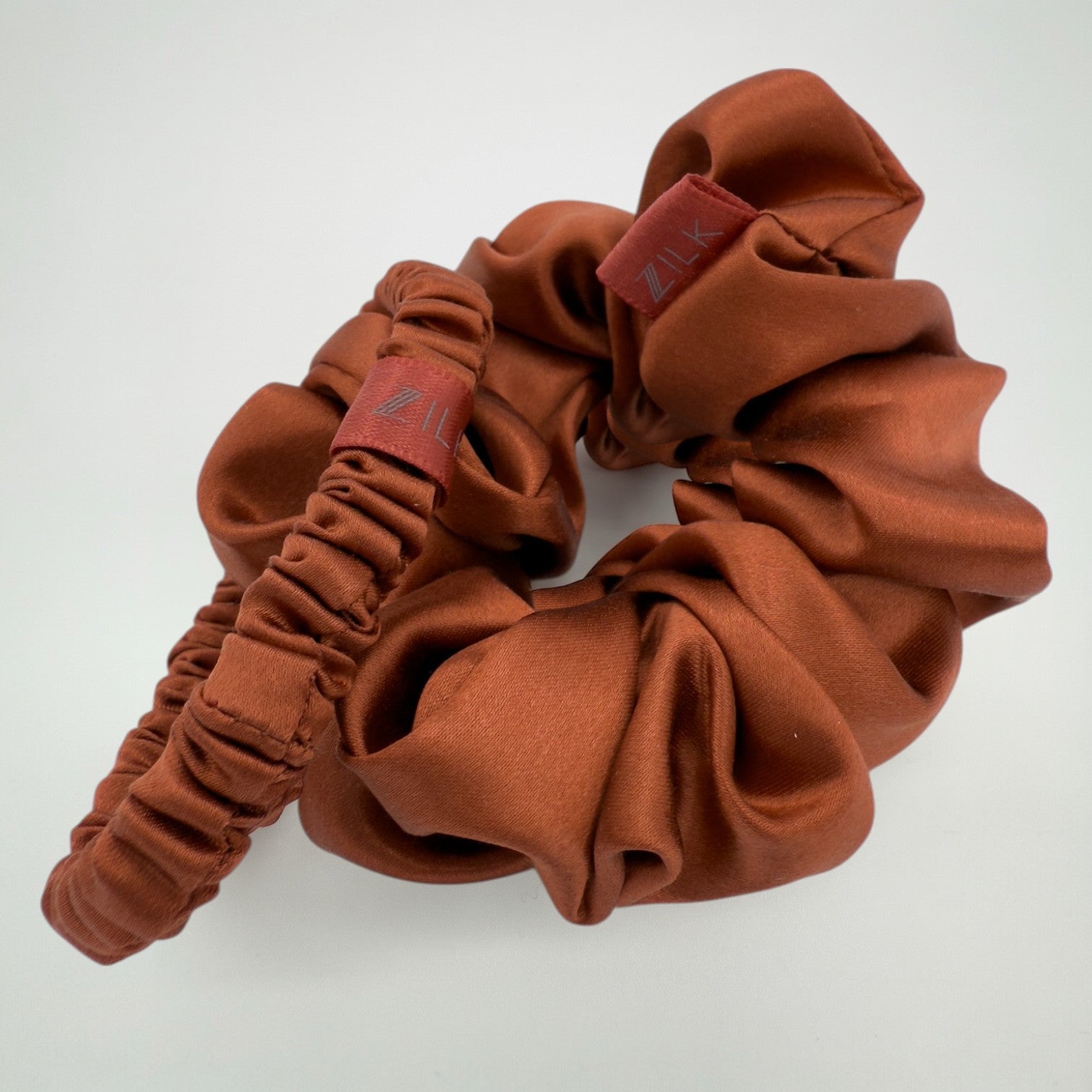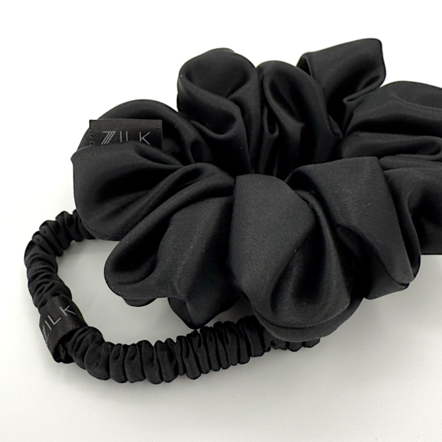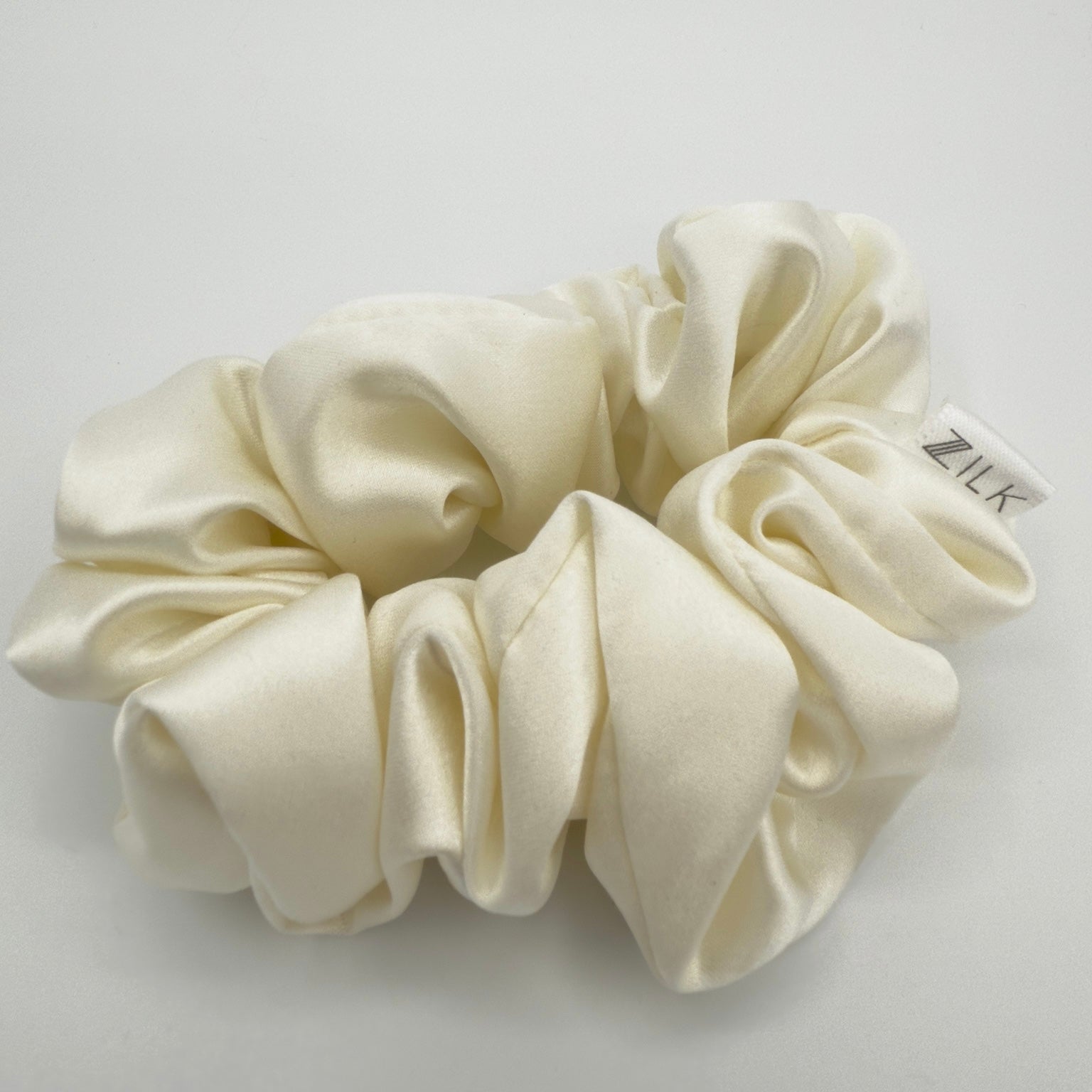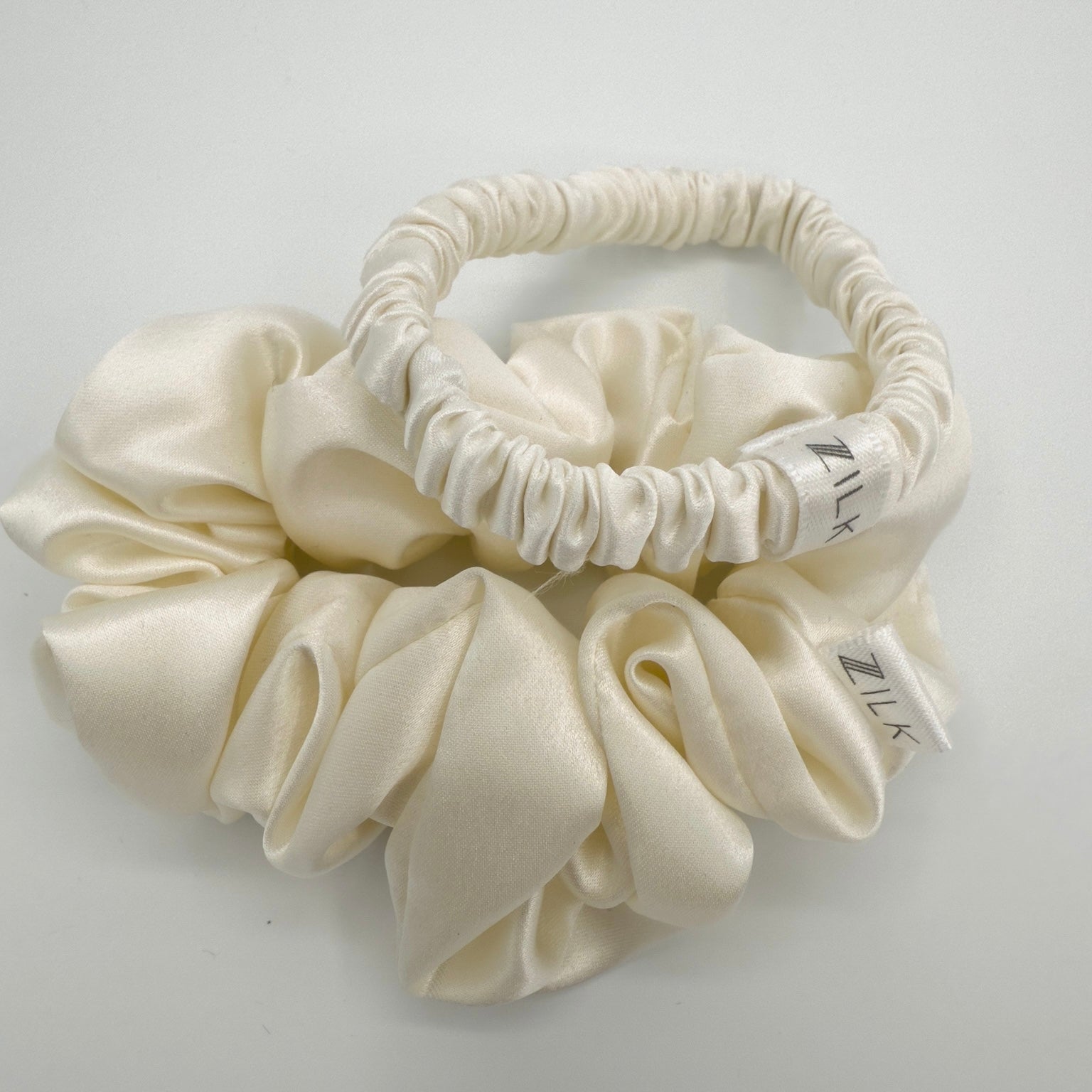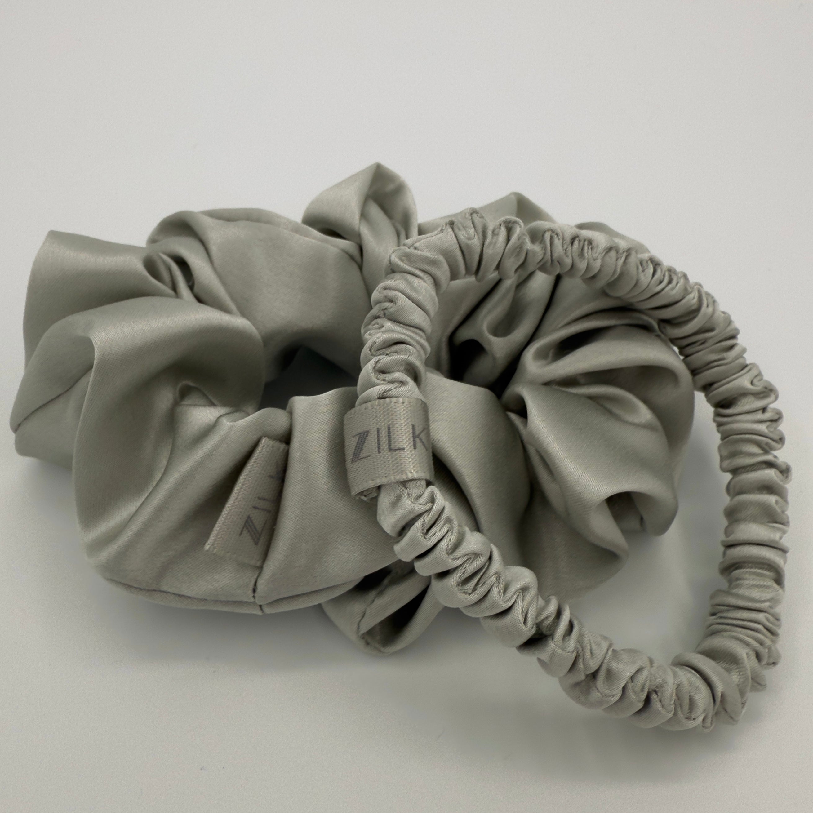 ZILK scrunchies are crafted with 25 momme Mulberry silk and infused with silver ions. They protect hair from breakage and frizz, resist bacteria, and maintain their smoothness longer than standard silk scrunchies.