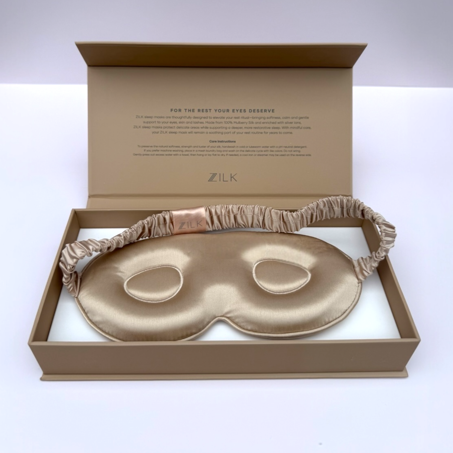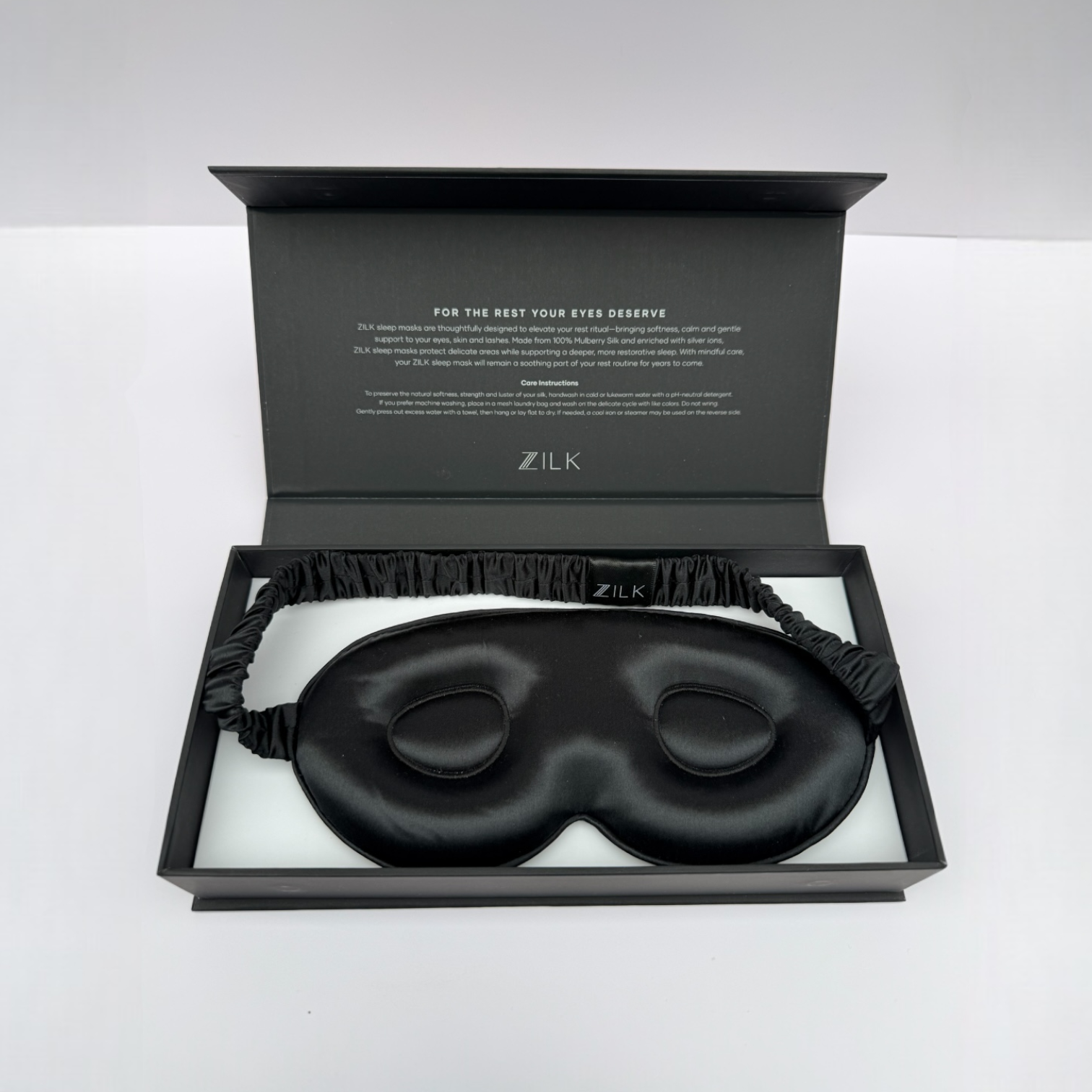 The ZILK Sculpted Silk Sleep Mask with Flex Band is crafted with NeuroSilk™ — our silver-ion infused 25-momme Mulberry silk designed to protect lashes and support deeper rest.