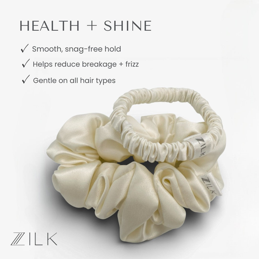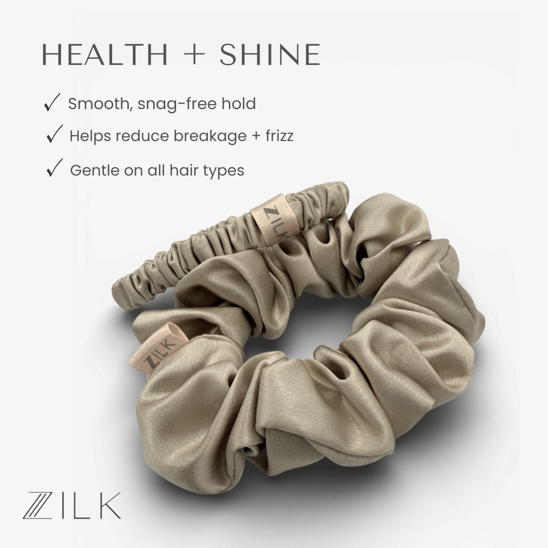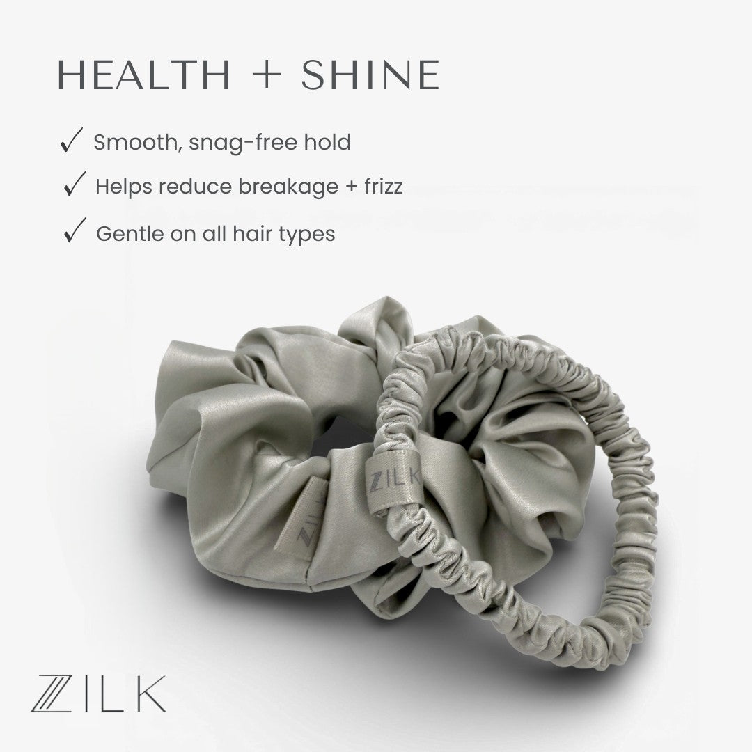 ZILK scrunchies are crafted with 25 momme Mulberry silk and infused with silver ions. They protect hair from breakage and frizz, resist bacteria, and maintain their smoothness longer than standard silk scrunchies.
