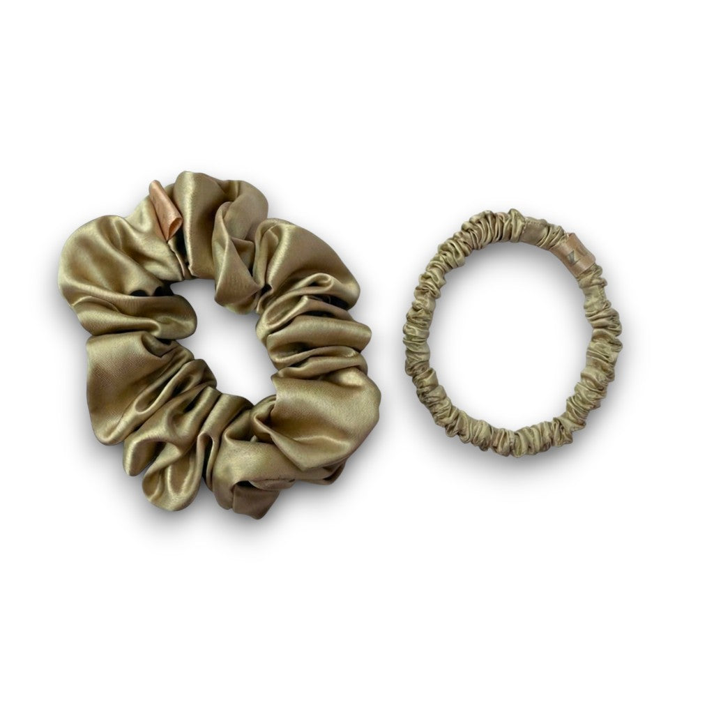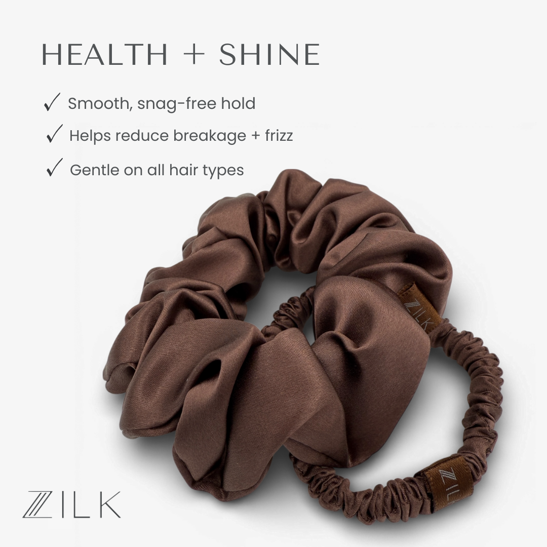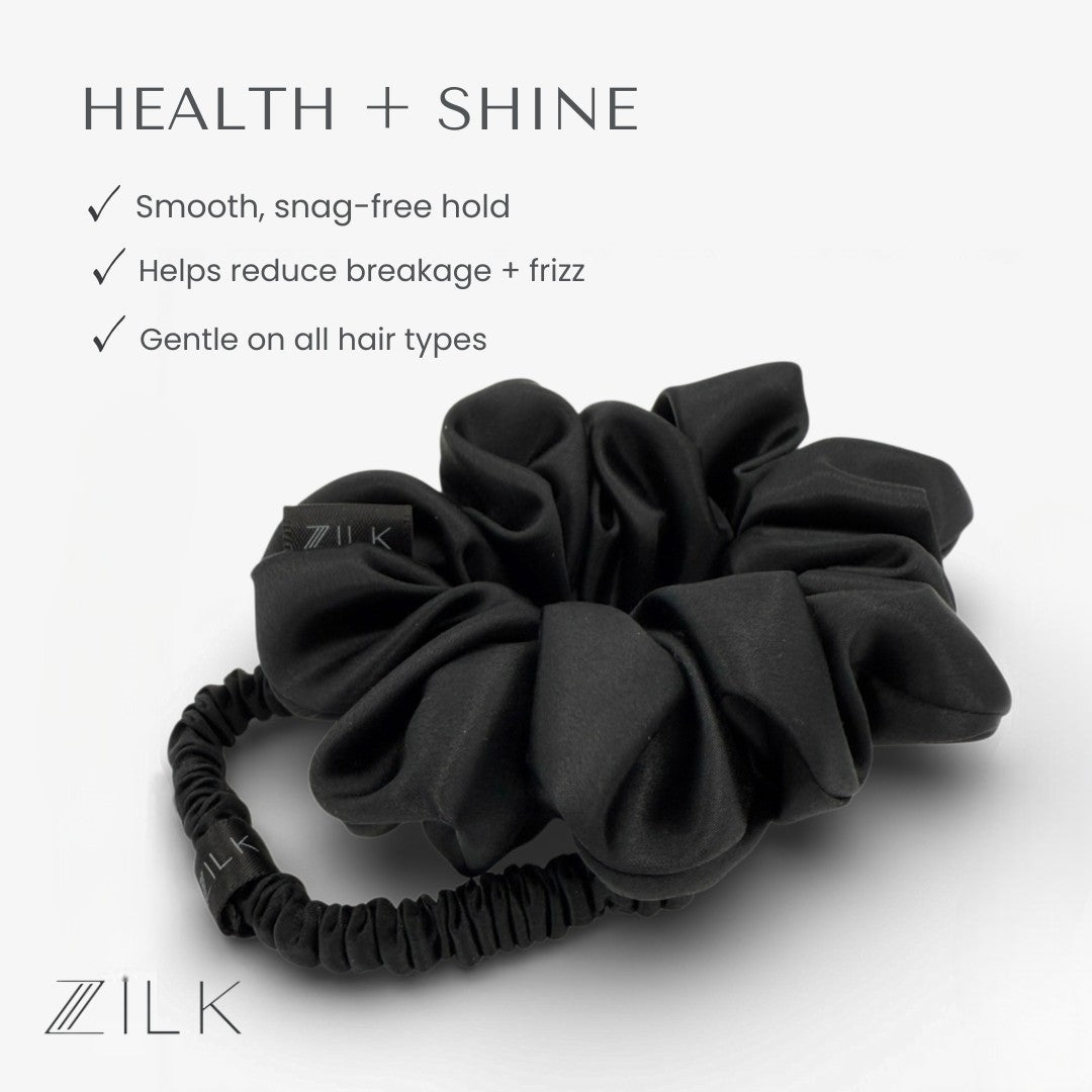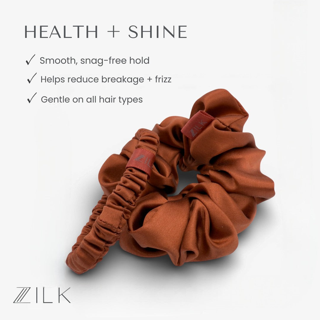 ZILK scrunchies are crafted with 25 momme Mulberry silk and infused with silver ions. They protect hair from breakage and frizz, resist bacteria, and maintain their smoothness longer than standard silk scrunchies.