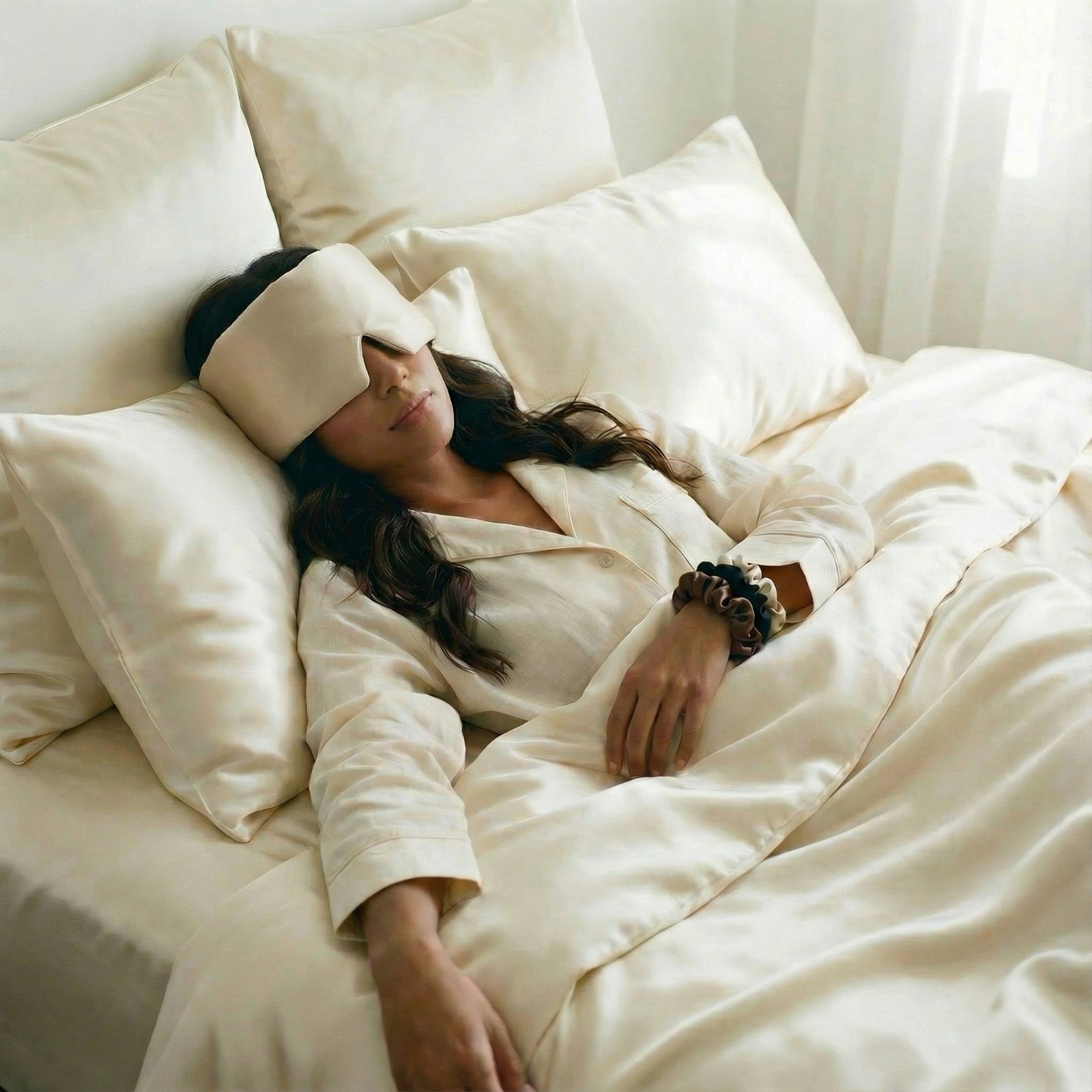 Full blackout, adjustable comfort — silk that soothes, secures, and restores.