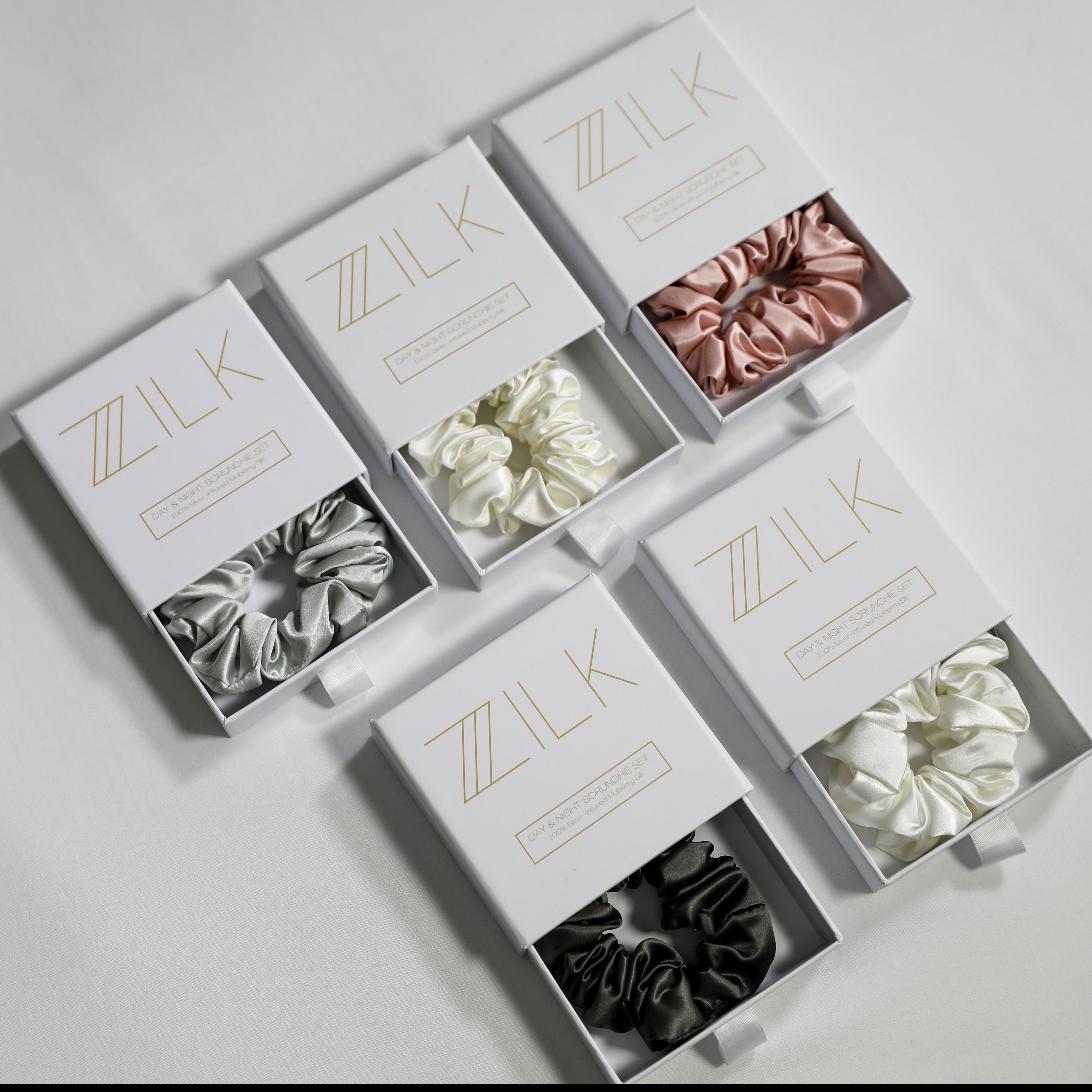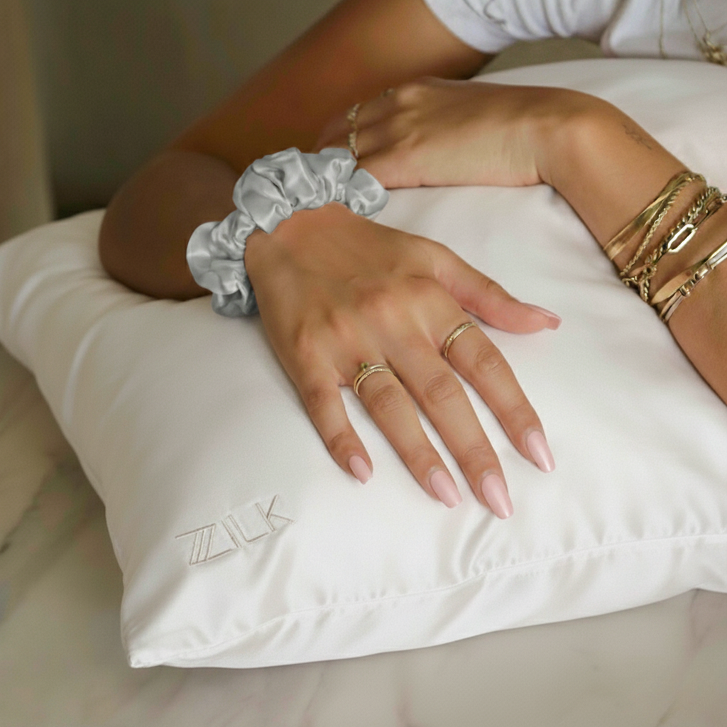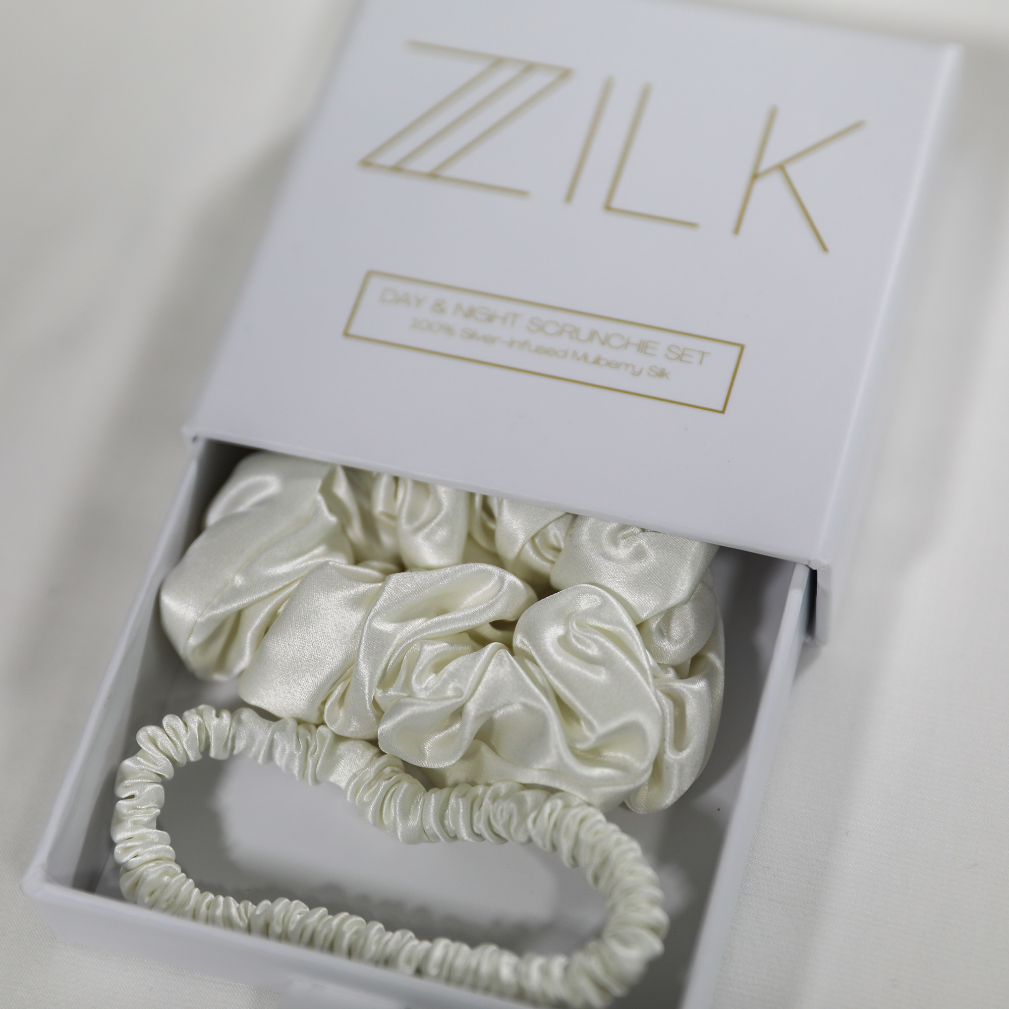 ZILK scrunchies are crafted with 25 momme Mulberry silk and infused with silver ions. They protect hair from breakage and frizz, resist bacteria, and maintain their smoothness longer than standard silk scrunchies.