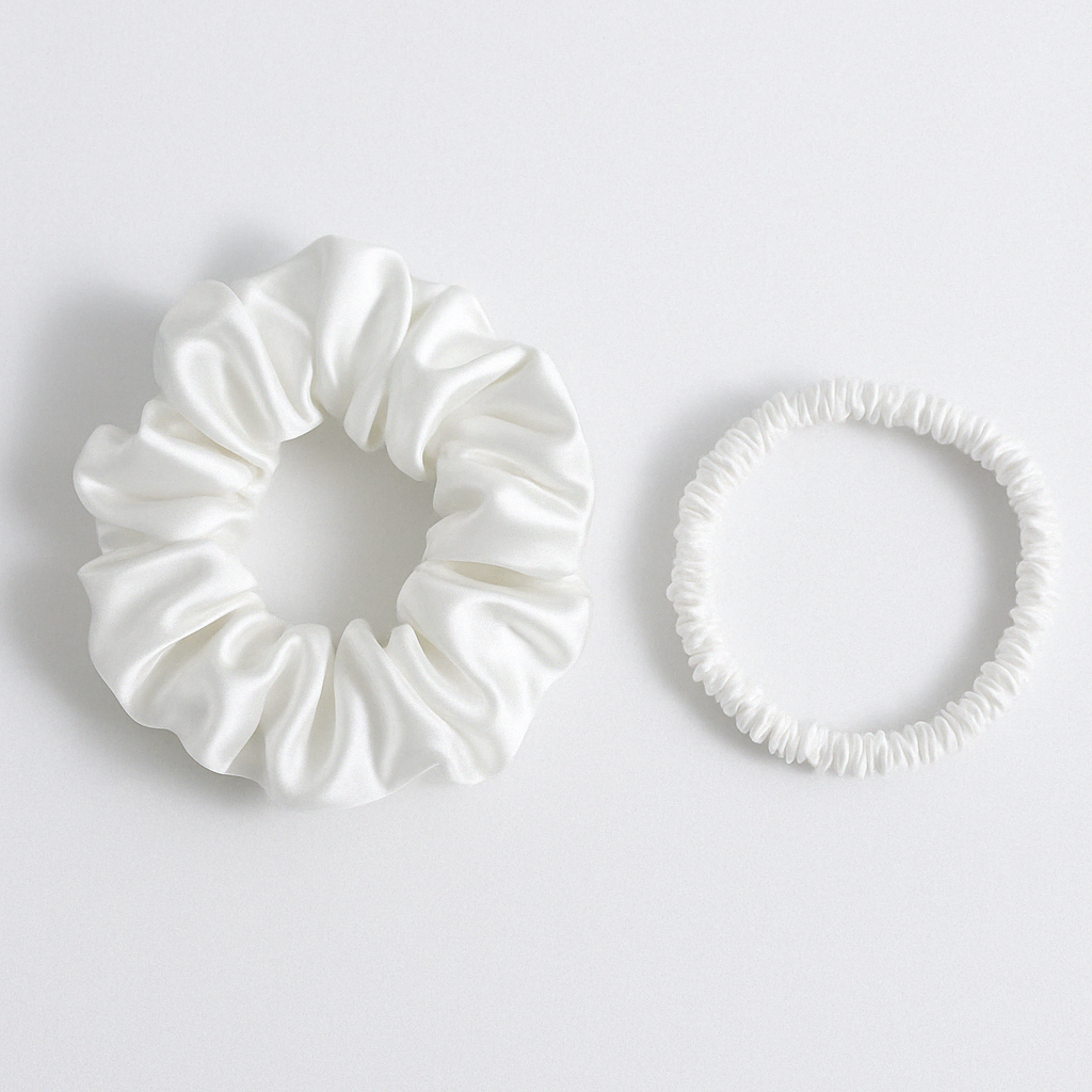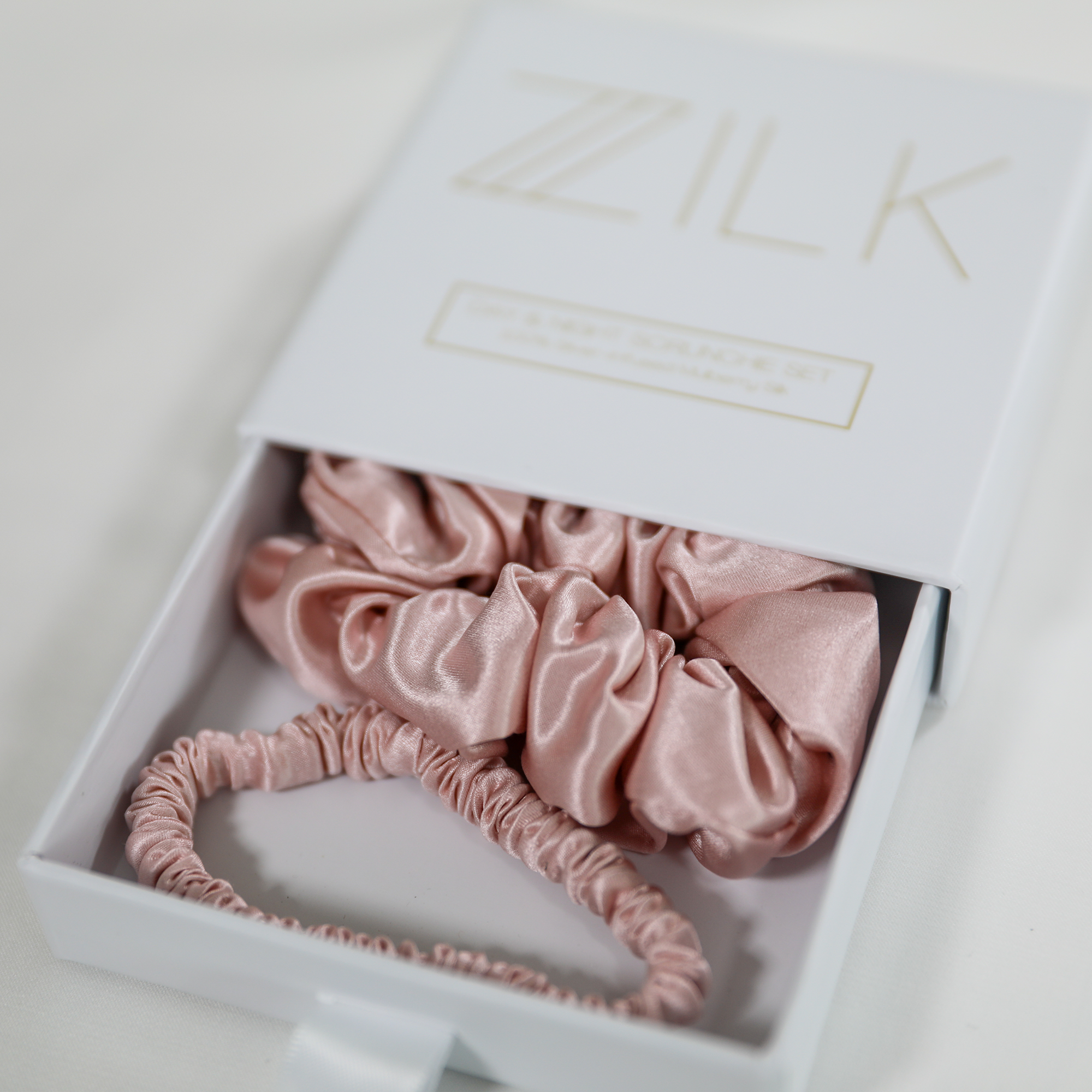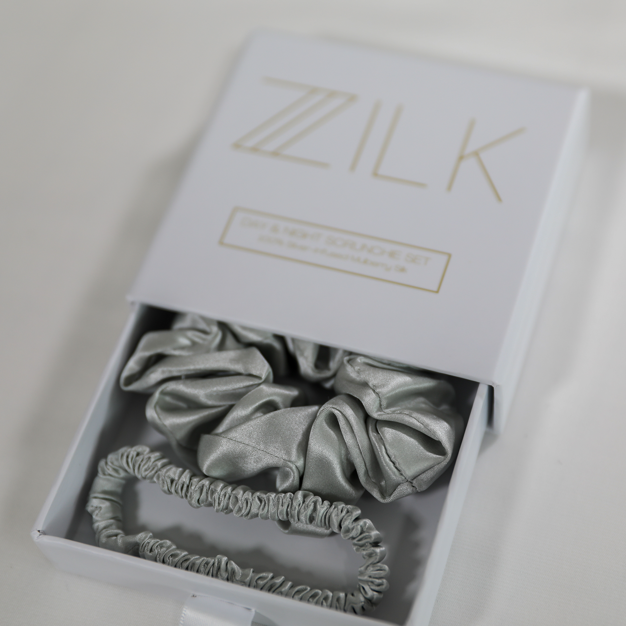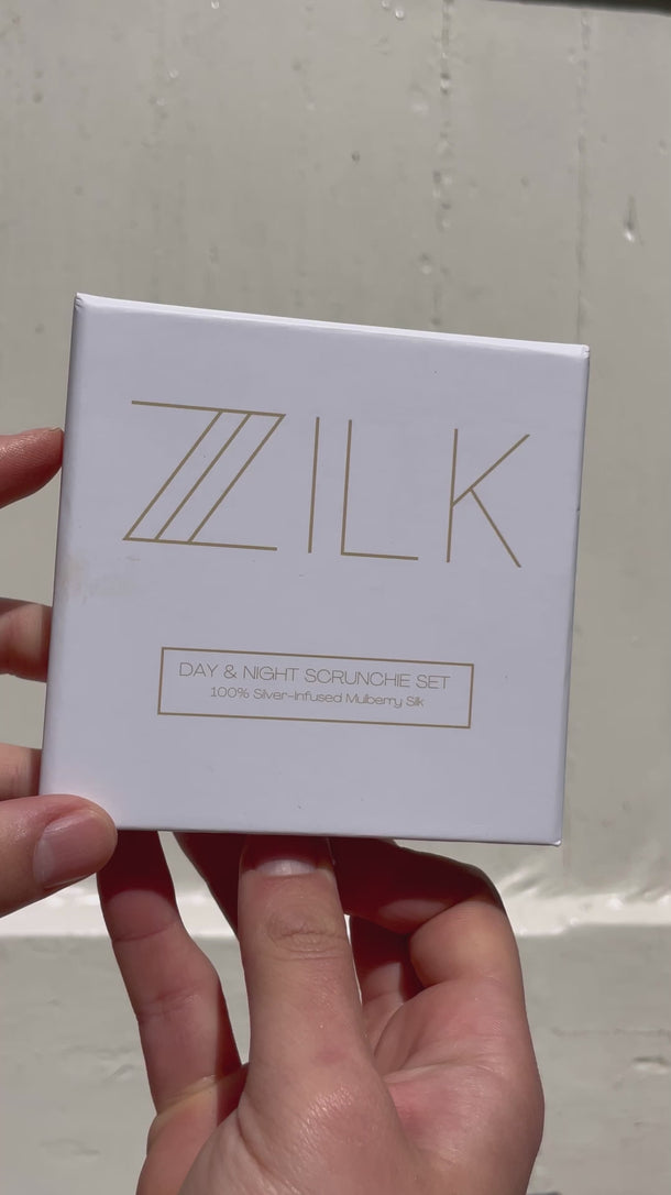 The ZILK Day + Night Scrunchie Set includes two silk scrunchies designed to protect your hair around the clock. The slim “day” scrunchie offers a sleek, comfortable hold without creasing or pulling. The plush “night” scrunchie is soft and protective, ideal for sleep or post-shower care. Crafted with our signature NeuroSilk™, both scrunchies help reduce friction, minimize breakage, and keep hair healthier and smoother.